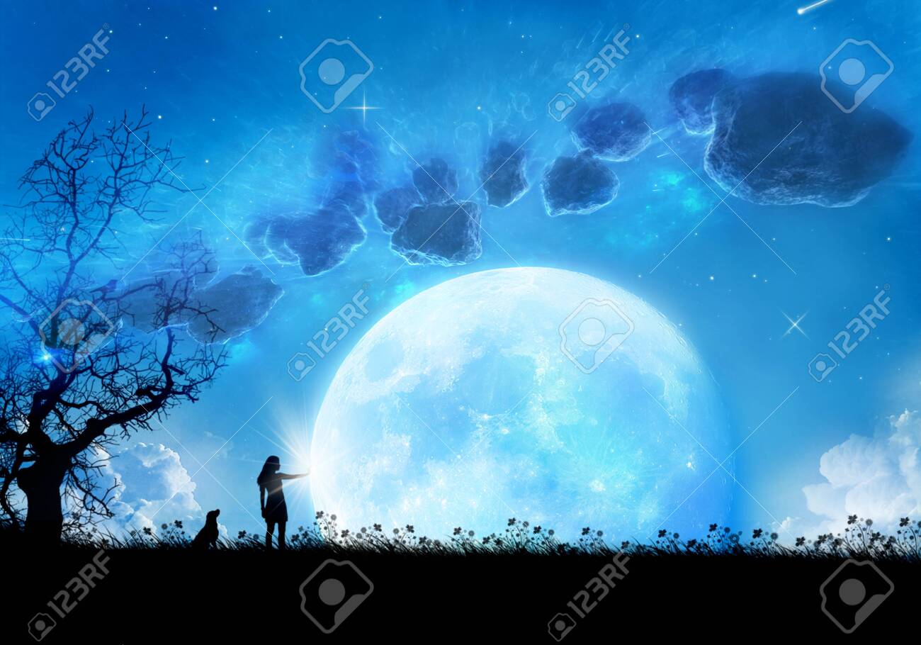 Abstract Artistic Digital Drawing Rendering Illustration Of A Woman And Her Dog On A Grass Field Touching The Moon With Asteroids All Over Them Stock Photo Picture And Royalty Free Image Image